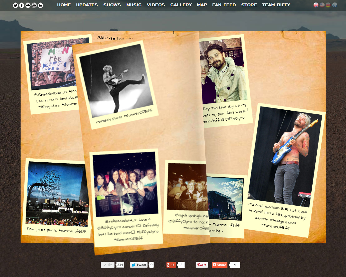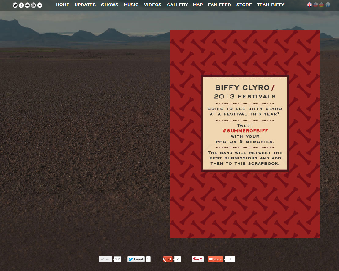 Biffy Clyro had one hell of a summer season in 2013, playing festivals all over Europe. The band’s management wanted to capture the events through the fans, so I proposed a digital scrapbook, filled by fans and curated by Biffy Clyro.
